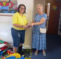 Our President Angela House presents a cheque for £400 to Petts Wood Playgroup.